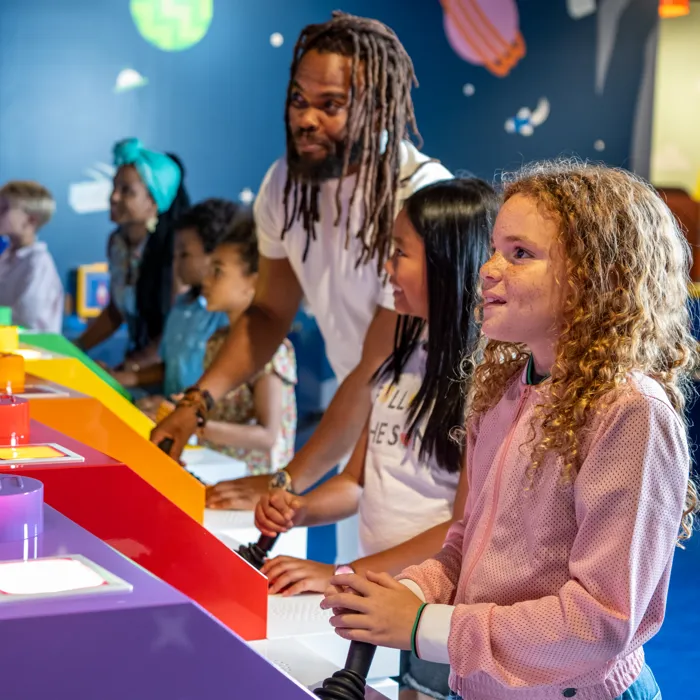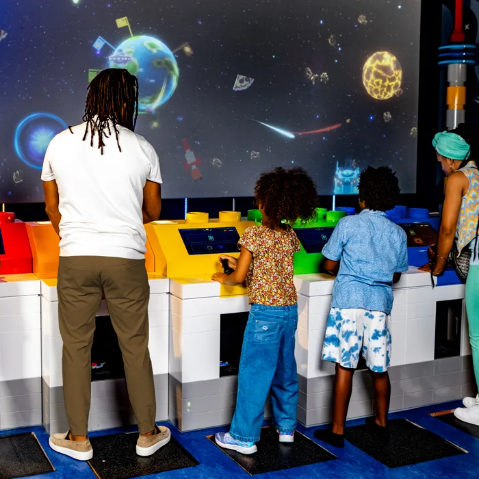 Once your craft is complete, take the pilot’s seat and prepare for launch: 3…2…1… Lift-off! Your mission comes to life on a giant screen, where friends and family can watch as you dodge asteroids, explore new planets, and navigate through mysterious cosmic clouds.